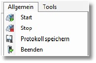 Hier wird die Anwendung beendet. Es wird zunächst die Verarbeitung gestoppt (Siehe Allgemein > Stop) und danach die Anwendung beendet.