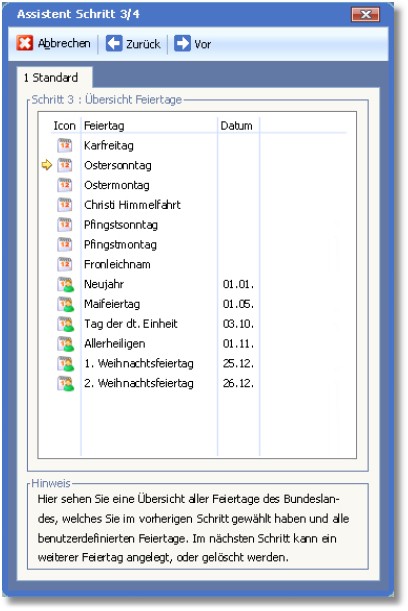 3. Im Schritt 3 des Assistenten wird nun eine Übersicht aller beweglichen und unbeweglichen Feiertage angezeigt.
