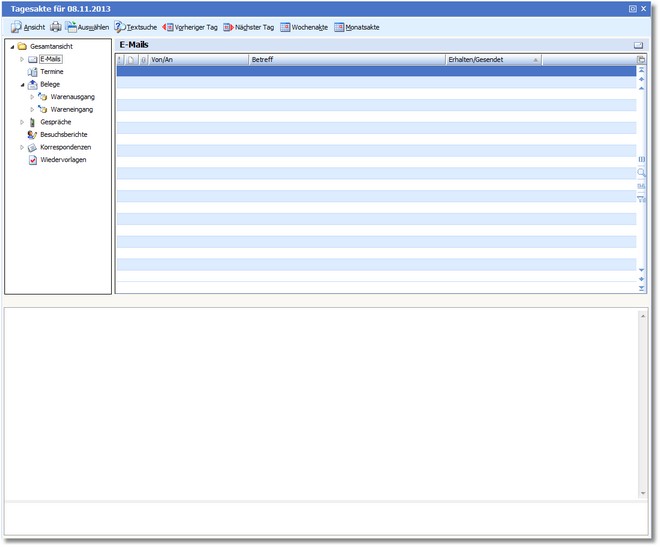 Das Programm öffnet für den heutigen Tag die Tagesakte.