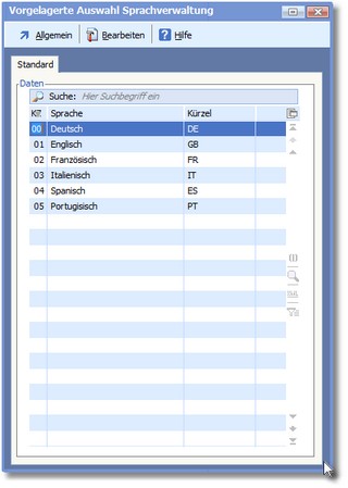 Das Programm öffnet die vorgelagerte Auswahltabelle der Sprachverwaltung.
