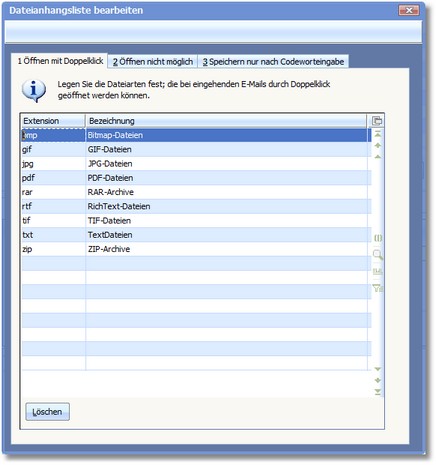 In diesem Dialog werden die Dateiarten festgelegt, welche bei allen eingehenden Mails mit Doppelklick geöffnet werden können, vorausgesetzt, die zum Öffnen der Dateien notwendigen Programme sind installiert.