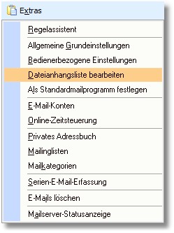 1. Wählen Sie in der Menüleiste des Mailsystems den Menüpunkt "Extras > Dateianhangliste bearbeiten".
