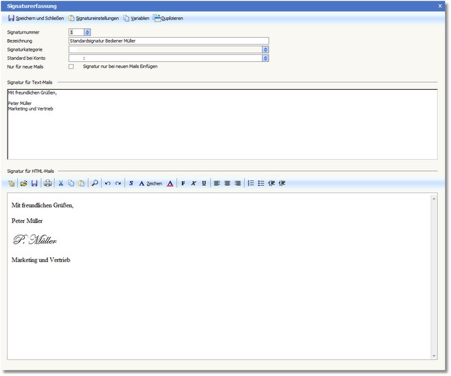 Beim Erfassen/Ändern einer Signatur werden folgende Felder ausgefüllt: