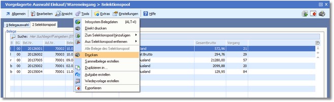 1. Um den Sammelbelegdruck zu nutzen, überstellen Sie zunächst alle notwendigen Belege in den Selektionspool und aktivieren Sie anschließend die Karteikarte "Selektionspool".