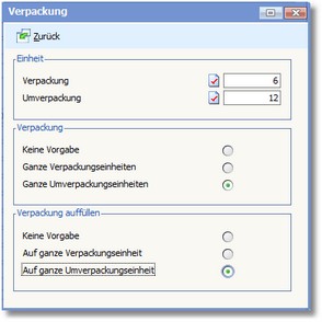 Hier können Sie durch Aktivierung des entsprechenden Radiobuttons festlegen, wie die Bestellmenge angepasst werden soll, wenn der Lieferant den Artikel ausschließlich in ganzen Verpackungs- bzw. Umverpackungseinheiten liefert. Sie sollten hier folgende Kombinationsmöglichkeiten verwenden: