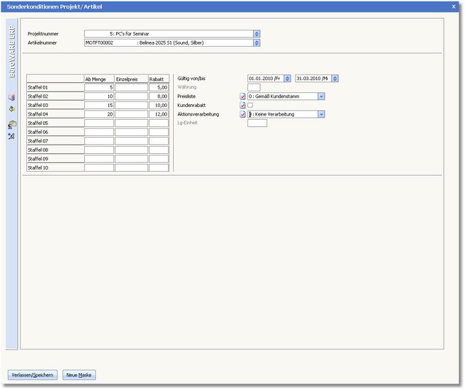 Der Dialog "Sonderkonditionen Projekt/Artikel"