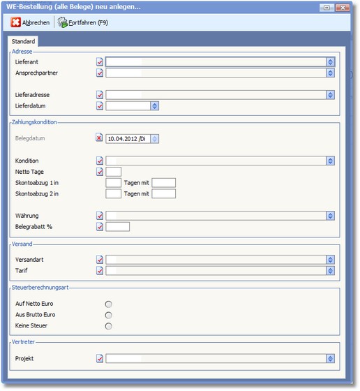 Das Programm öffnet den Dialog zur Erfassung eines neuen Bestellbelegs.