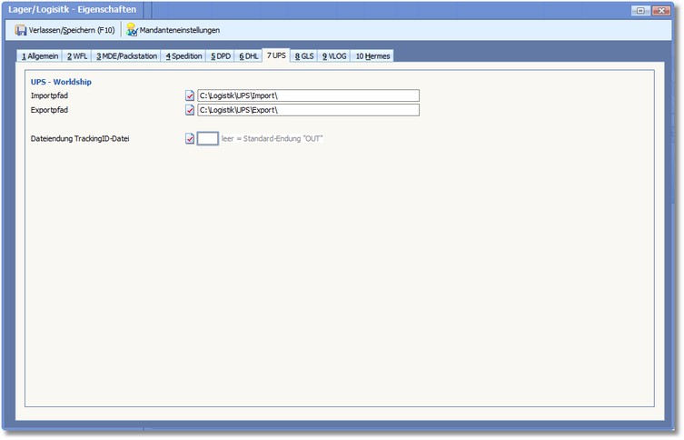 In dieser Karteikarte sind die Export-/Import-Einstellungen für die Schnittstelle zu UPS festzulegen.