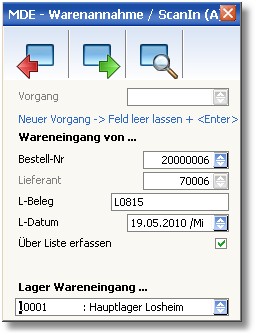 << Hier KLicken um eine Inhaltsübersicht anzuzeigen >> Navigation: Warenwirtschaft > Lagerverwaltung > Lager-/Logistikcenter > Mobile Datenerfassung (MDE) > WeAn - Wareneingang |